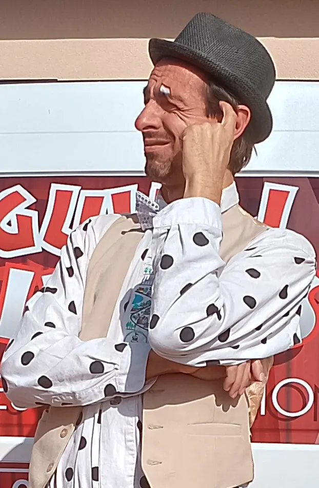 Christophe Anguilli alias Jacob le clown, vendeur de joie et de bonne humeur depuis plus de vingt cinq ans, situé dans la Loire proche de Saint Etienne.