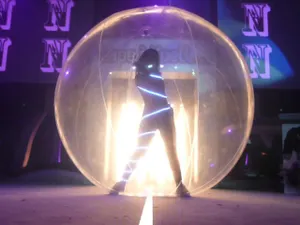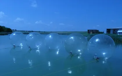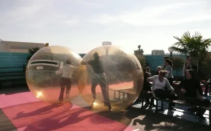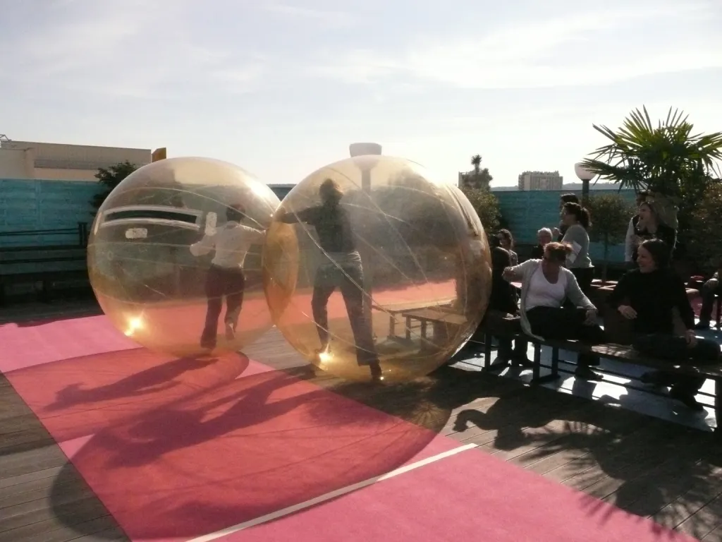 Le participant est invité à se positionner dans cette bulle géante gonflable. Une fois la mise en place terminée, le sujet peut à sa guise évoluer sur l’eau ou bien sur le sol. Des challenges et thématiques sont proposés suivant le nombre de personnes et les particularités des sites. Nous fabriquons aussi des sphères, bulles, boules, de tailles différentes, des demis-sphères pour mettre des voitures, ou bien des DJ.