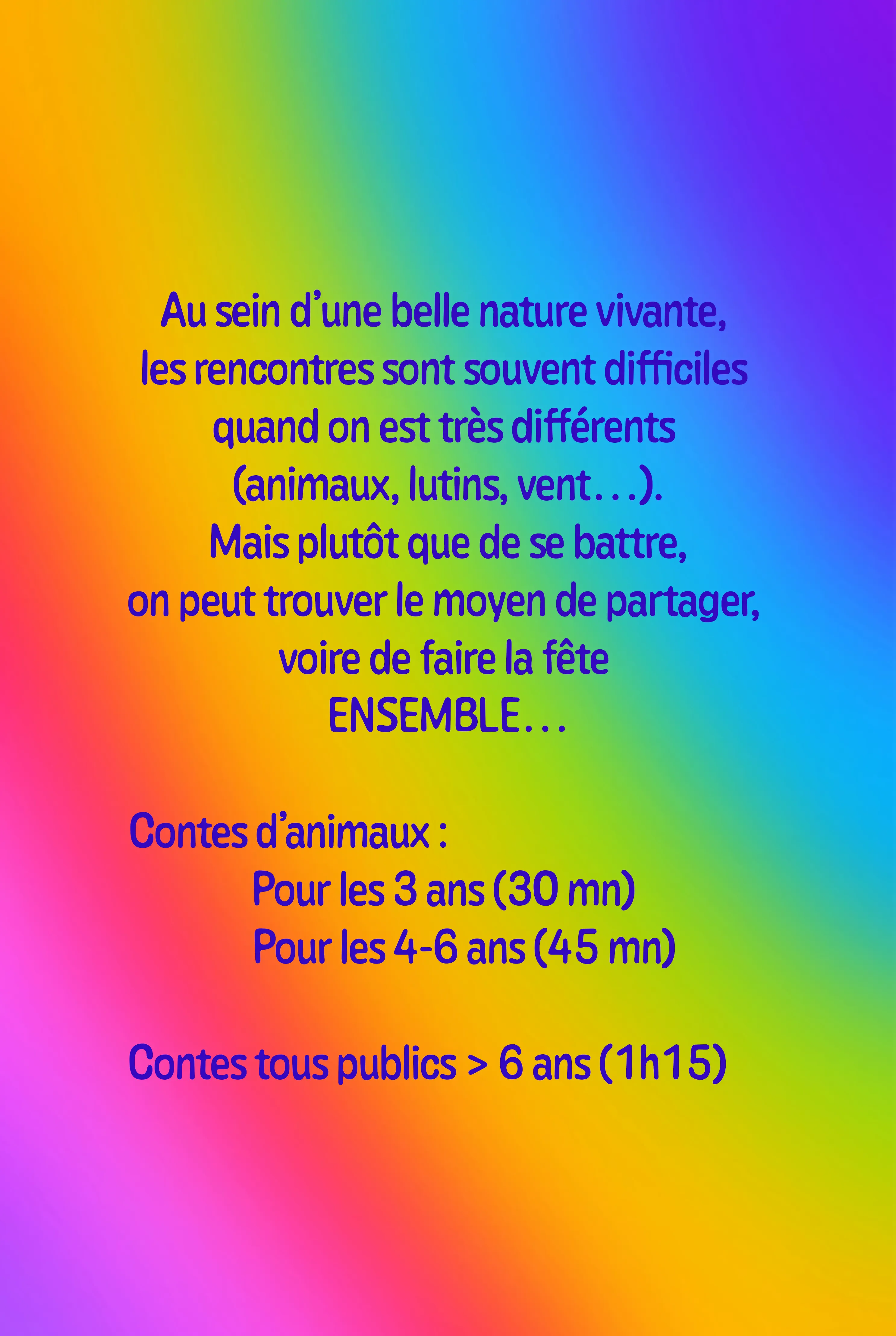 Contes d'animaux écrits par ARC-EN-CIELLE (3 à 4), avec ou sans 1/4h de marionnettes incluses. Ce sont des contes doux qui, à travers des rencontres difficiles, enseignent aux enfants la confiance en la vie, la confiance en les autres, et la confiance en soi. Cela permet de s'ouvrir, et de partager la vie avec les autres, même et surtout s'ils sont différents. Tout cela au sein d'une belle nature foisonnante de vie et de chants d'oiseaux. Cela dure 45mn, animées par le doux son de ma kalimba.