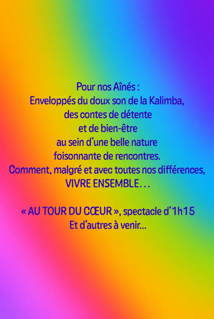 (5) 17/01/2025Les spectacles d'Arc-en-cielle sont de merveilleux moments à partager. Petits et grands se laissent embarquer dans un univers de douceur et de poésie, portés par l'état heureux et joyeux de la narratrice. Les enfants adorent et leurs parents ou encadrants se laissent facilement prendre la main pour rêver avec eux, au grès des mots et des notes de musique qui s'envolent. L'expérience de l'artiste se renforce d'année en année et il est formidable de voir comme elle sait se laisser guider, elle-même, par les réactions de son jeune public. Elle a cette capacité de savoir adapter ses spectacles poétiques au gré des petits cœurs qui palpitent, des visages émerveillés et des yeux qui s'envolent dans les nuages. Laurent (directeur de structures sociales et de petite enfance).