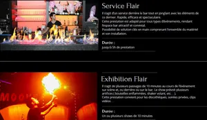 Il sagit de plusieurs passages de 5 à 10 minutes au cours de l'événement sur scène et, ou derrière ou sur le bar. Le show prévoit plusieurs artifices ( bouteilles enflammées, shaker volant, etc... ). Cette prestation convient pour les discothèques, soirées privées, clips vidéos...