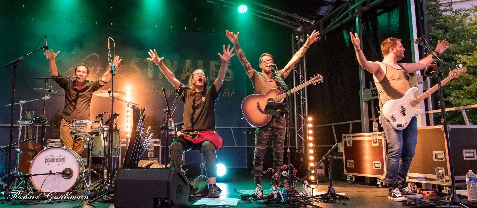 COMRADES en live, c'est une ambiance chauffée à blanc, un bateau voguant sur des flots de bras tendus, un groupe finissant ses concerts au milieu du public. Retrouvez les toute l'année partout en France, pour vos événements "tout public" ! Un de ces concerts "différents" et régénérants, mêlant une musique ultra chaleureuse à l'humour et à la folie contagieuse des membres du groupe ! Option possible avec le trio de danses irlandaises The Celtic Fairies et initiation à la danse celtique pour le public (sur demande)