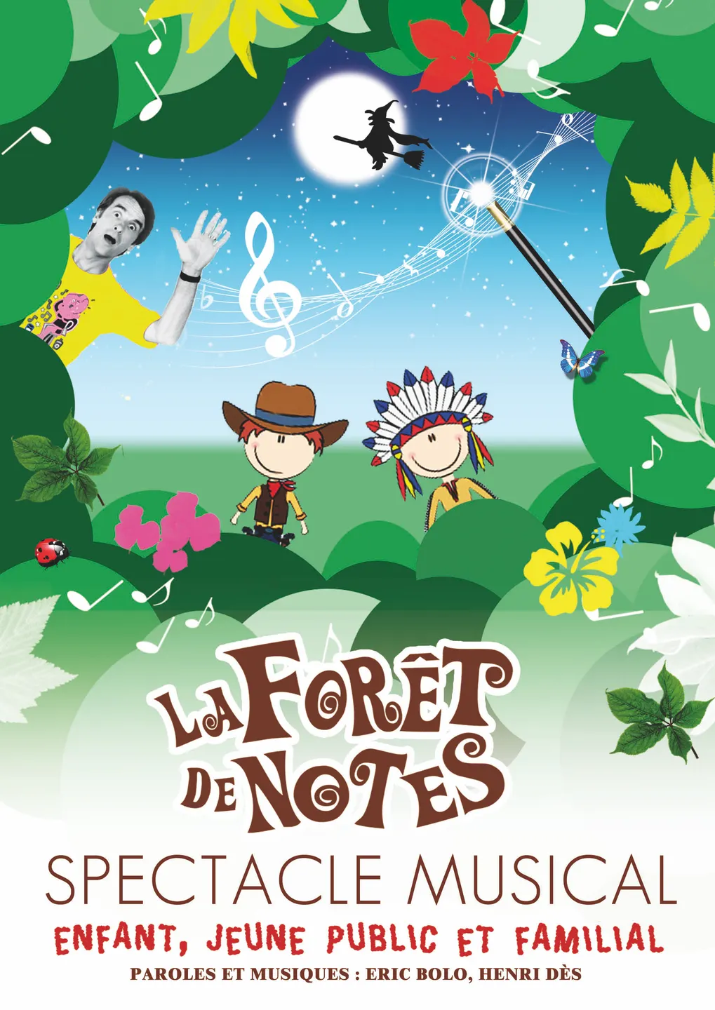 Avec humour et passion, pour le plaisir des petits et même des grands, Eric Bolo et ses amis musiciens revisitent le répertoire d’Henri DES et interprètent des compositions personnelles. Tout en chansons et interactivité, voici le beau voyage musical de et dans « La Forêt de Notes » 1 heure de sourire, de rêve, de danse, de partage et de bonne humeur où chat flamboyant, indiens, cow-boys, sorcière et autres surprises cohabitent dans cette aventure ludique et magique pleine de rebondissement !… Un excellent prétexte pour rêver,chanter,danser, participer aussi tout au long de ce spectacle musical interactif....