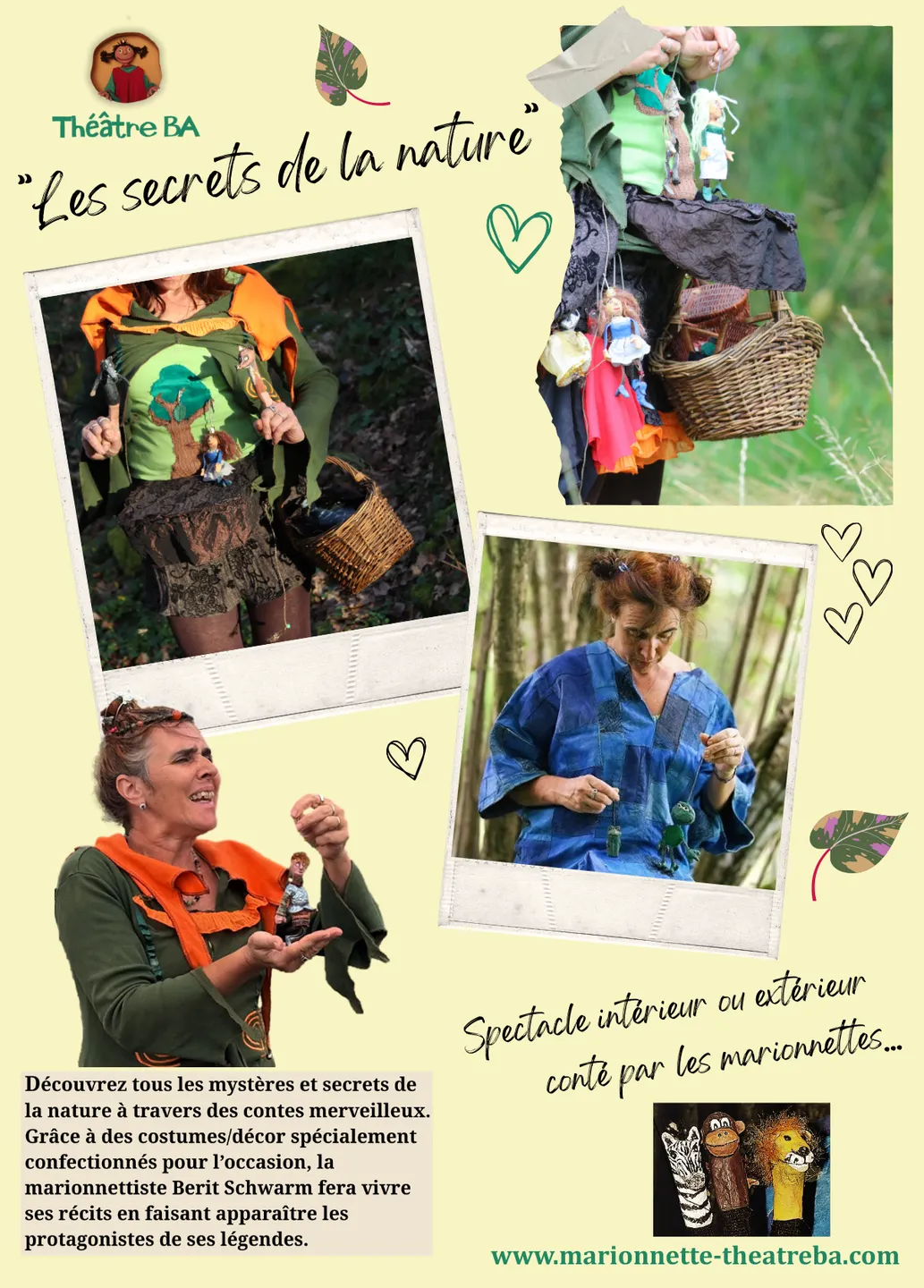 La compagnie Théâtre B.A. est établie en Bretagne depuis 2003 et s'attache à proposer des spectacles de marionnettes vivants pour petits et grands. Les membres de la compagnie cherchent à transmettre l’art de la marionnette en créant des situations adaptées à chaque âge (représentations et/ou travaux pratiques), afin d'éveiller les capacités imaginaires, d'élargir le potentiel créatif, développer la sensibilité de chacun dans l'objectif de découvrir les trésors enfuis en nous.